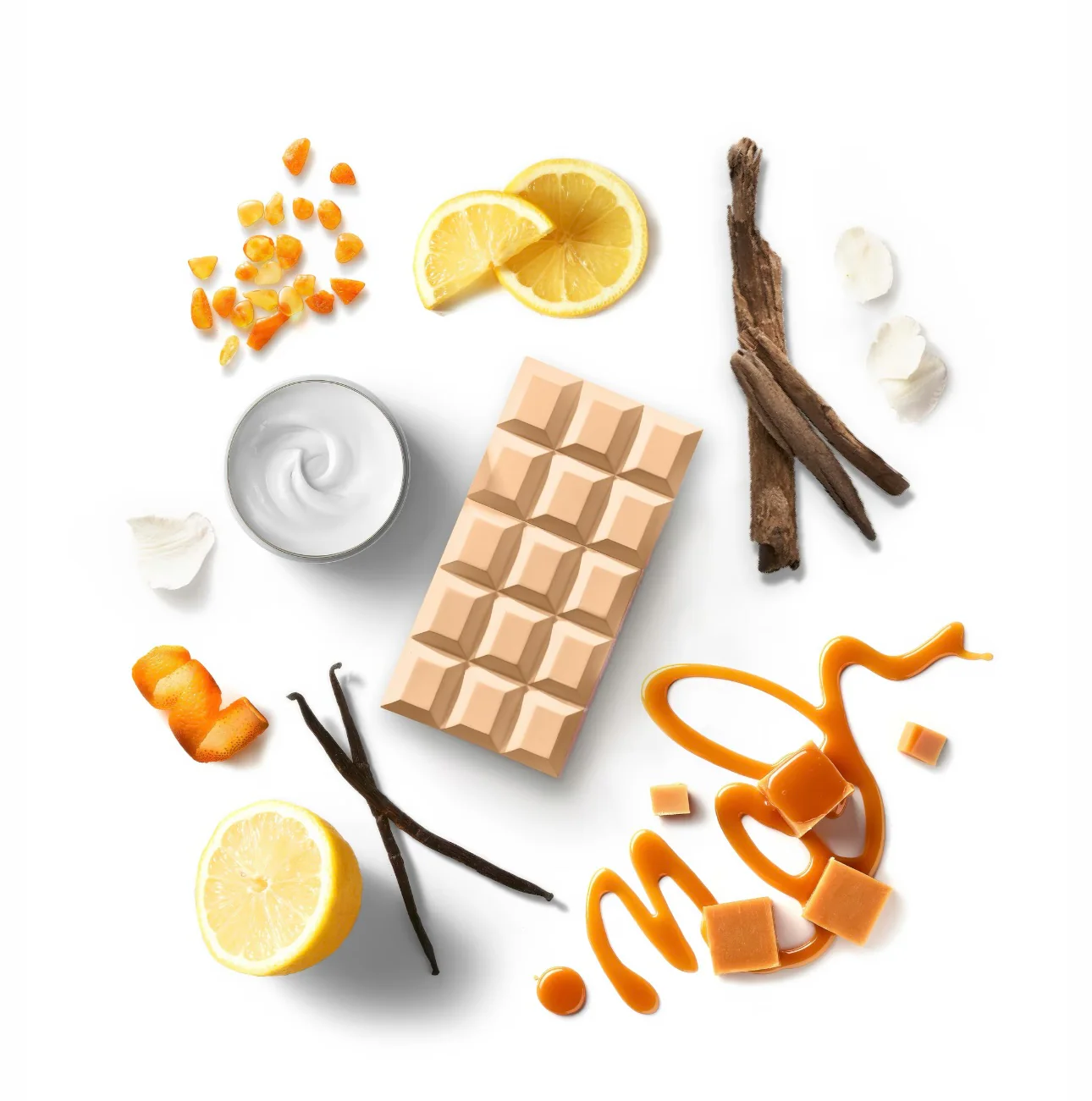 The fragrance opens with a soft, romantic blend of almond milk and freesia, balanced by the brightness of sugared lemon and orange zest. At the heart, rich dark chocolate and smooth vanilla intertwine with delicate orange blossom, creating a luxurious and addictive middle. The base finishes with sensual caramelised amber, creamy sandalwood, warm musk, and earthy patchouli for a long-lasting, sweetly seductive trail.